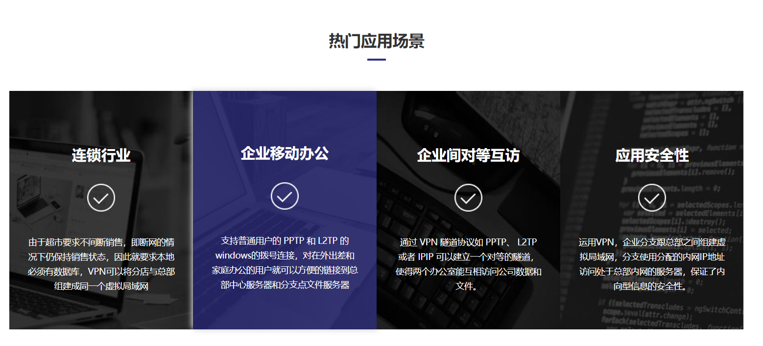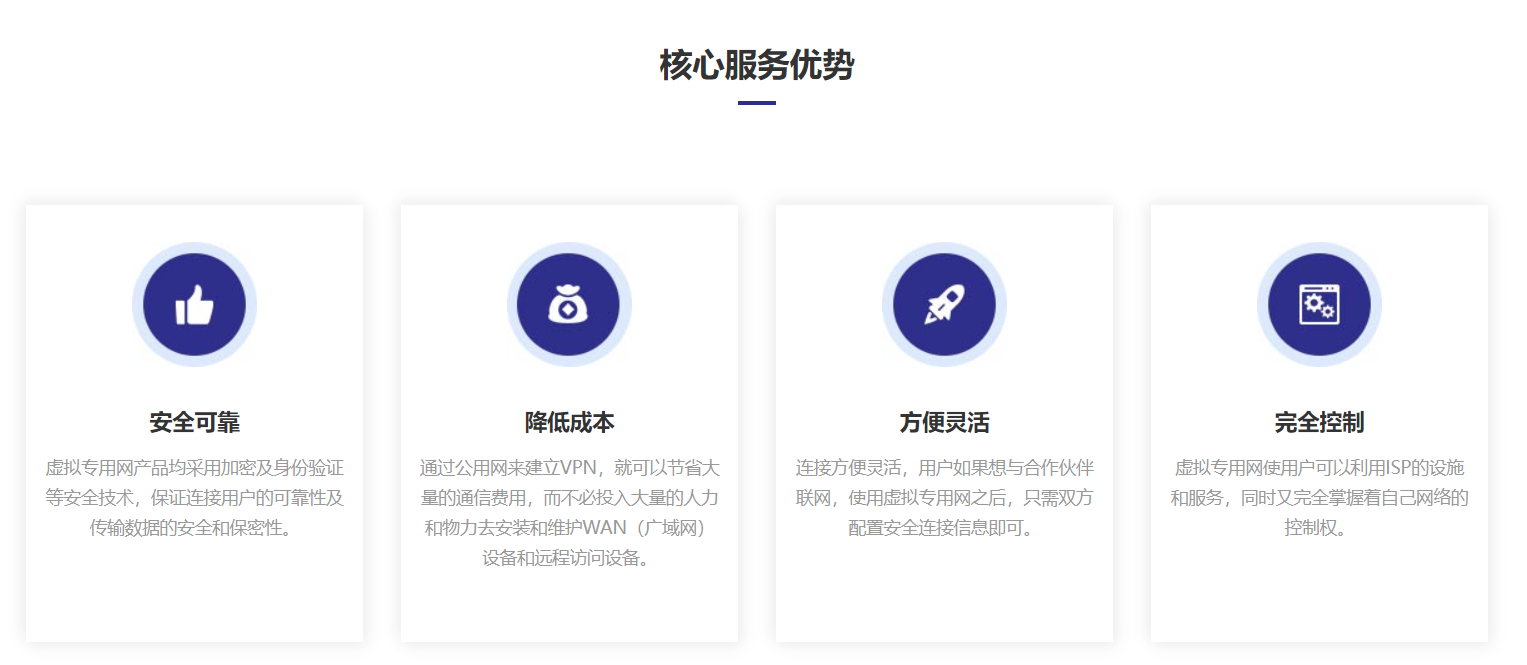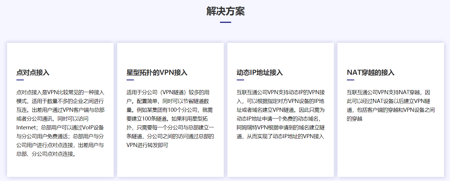 互联互通公司VPN平台提供了经济高效的解决方案。支持多种接入模式,可以在不同的网络环境非常方便、灵活地建立VPN隧道; 同时具有强大的加密和认证功能,保证数据在Internet上传输的安全性。